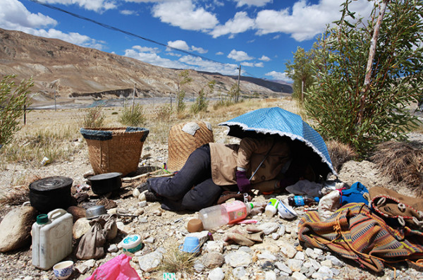 甲庆村,路边小佛堂前,转经的老人拍了拍她身边,让我过去坐,倚墙边搭起一块木板,铺着旧卡垫。