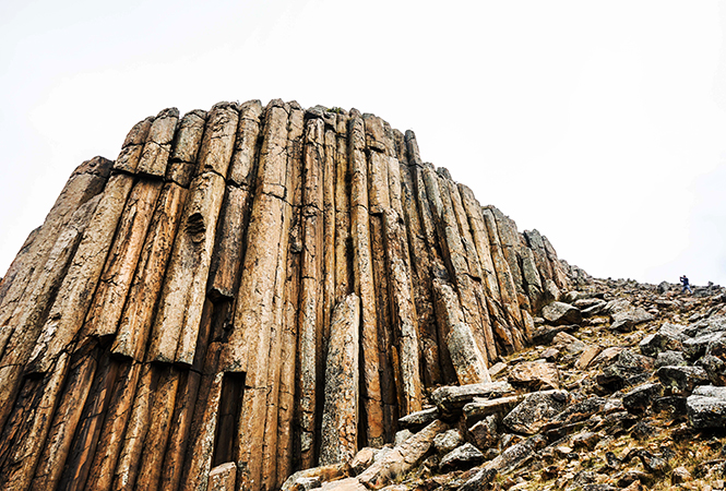 太仆寺旗政府所在地宝昌镇以西5公里处,有一座火山喷发后形成的玄武岩柱状节理地质景观——石条山。风太过凛冽。山顶海拔1700米,爬到1650米的地方时,喘气的声音把自己都吓了一跳,只好停在那里,仰望那片壮观的石山,任思绪穿越亿万光阴,想像曾经这里的样子。