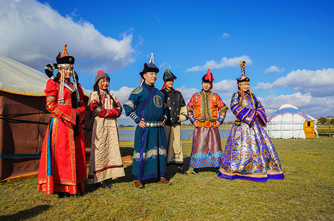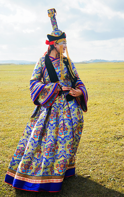 上都湖牧场被蓝天碧湖包裹着,再加上雍容华贵的13世纪蒙古宫廷服饰,美得一塌糊涂。在一身蒙古服饰中,我最感兴趣的是女子的头饰。远在青铜器时代,蒙古高原就有了头饰的制作工艺。头饰多采用金银、蚌、玉石、水晶、玛瑙、金属和赭石等原料制作,以多、大、重为美。一个盛装的蒙古族妇女,其头饰轻者有三、四斤,重者达十几斤。相比之下,我借来的平民蒙袍,黯然失色。再摸摸头顶,除了一顶御寒的毛线帽子,空空如也。