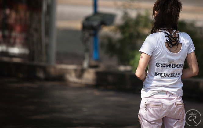 我还在纠结跟她说什么的时候就发现她衣服背上有几行字,而且是英语的:school punk。仔细看,前后还有两行,拼在一起就是:love schoolyard punk !!!(爱,校园,朋克!!!)