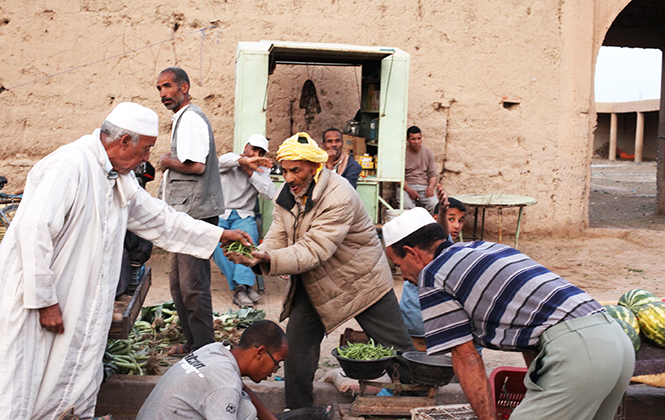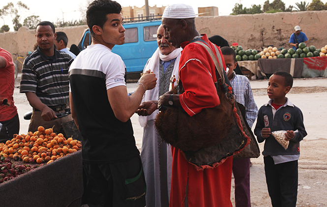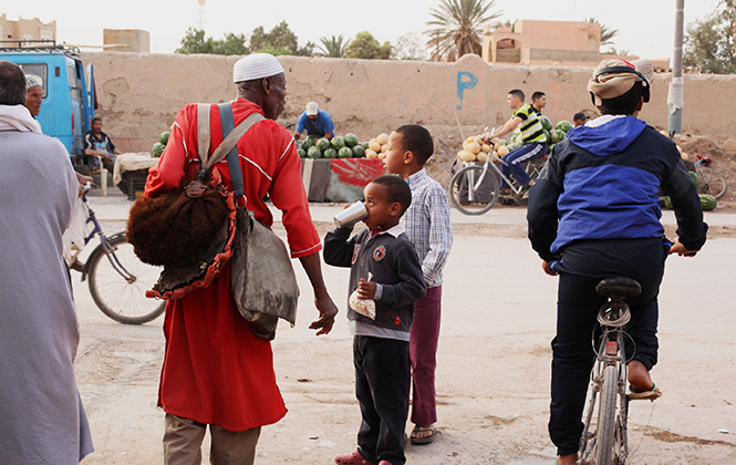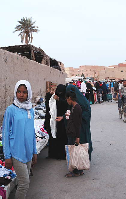 梅尔祖卡其实真的没什么,就是一个很寻常的沙漠小镇,特别一点的有一处black vally,生活着一群很早前从苏丹迁至此处的非洲黑人,他们有相当非洲的音乐表演,似乎路过此地的观光客都会来此小留。可是我更着迷于那个庞大的乱糟糟的市井气十足的当地集市,去看柏柏尔人如何进行牛羊买卖,看柏柏尔人友善微笑又机警地避开镜头,看柏柏尔人的首饰店里艳丽迷人的首饰……而就在集市的门口,我们还看到一位枯瘦的男人背着一个皮革制的水囊,许多人围着他,他从水囊里倒一杯水出来,递给某只伸向他的手,那只手喝完水,他简单地再倒一些水来轻轻涮一下,再重新倒一杯水,递给另外一只伸向他的手。
