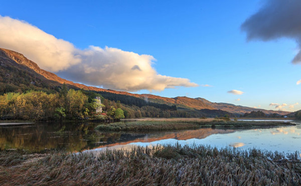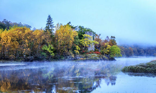 这个晴天意外的利索,温度还没升起,蓝色天空的饱和度已经破表,没有半点风雨欲来的阴影。我站在清晨雾气散去的Dochart湖边陶醉,岸边的芦苇被深秋慷慨的冰霜压完了腰身,脚下的湖水微微地荡着,并没有打湿我双脚的企图。湖对面,一座堡垒的废墟正从雾中走出来。