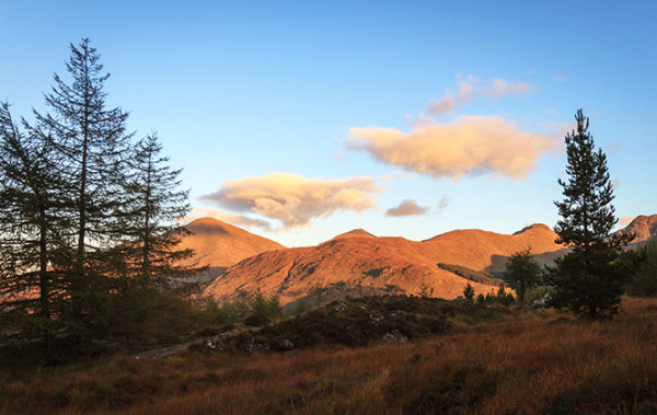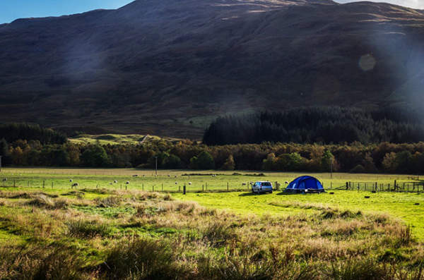 经过一段大口喘息的无情上坡路,我站在了山谷的高处,再次看到了Crianlarich的层叠山峰。原来我兜了一个半圆,才又回到它们的视线里。阳光已经上升到了峰顶,山谷里有炊烟飘起,有人在谷底的一块平地上支好了帐篷,正生火做饭。他的同伴穿着红色冲锋衣,坐在一旁研究一张摊开的地图。