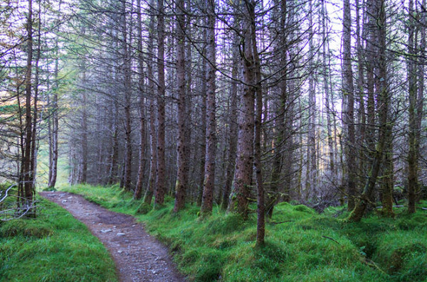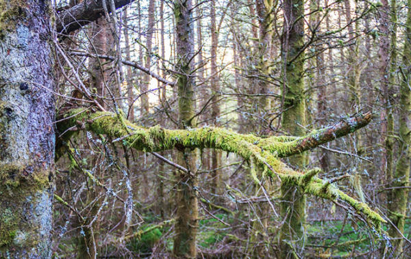 走进第三段,这里是巨人的花园,遮天蔽日的苏格兰松树正在向壮年前进,它们的枝干依然温柔多于坚毅,雾气沿着身后的上坡路漫了上来,好像是追逐我的军队。苔藓在这里找到了最适合它们的家,一些颜色发白如同到了可以给孩子们讲故事的年纪,一些还茂盛得要从树枝上垂向地面玩耍,躺在地面的树干很明显是被人砍倒的,然而为什么依然留在这里让苔藓将它们与周遭包围成一个整体呢。