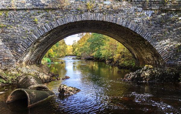 很快我就走进了Fillan河的流域,这里水面开阔平缓,据说是水獭的栖息地——尽管今天它们并没有出门晒日光浴。在河水下坠的地方,一座漂亮的、带着时光打磨痕迹的石桥跨越在水面上,桥下是零落的水泥管道。我拍了好些照片,走回步道时看到一个人正拿着地图边看边打量周围。