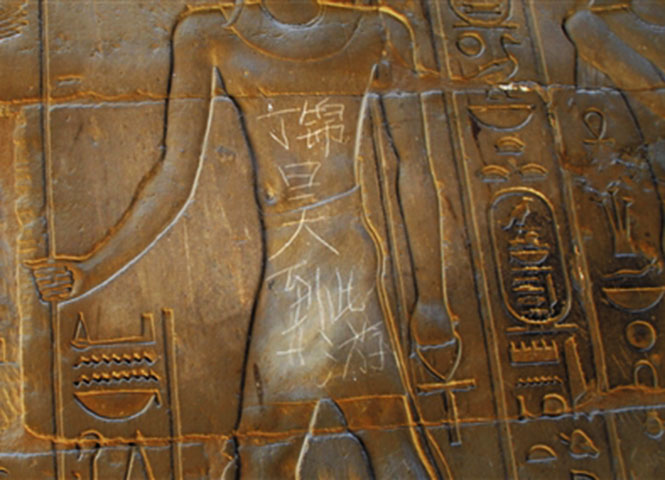 (埃及卢克索神庙浮雕上的“丁锦昊到此一游”涂鸦 图片来自维基百科)