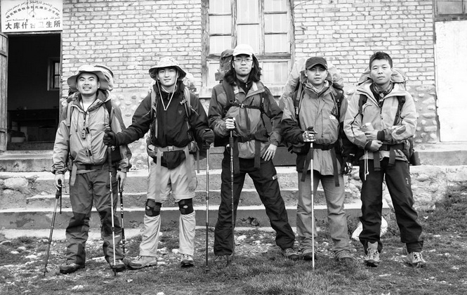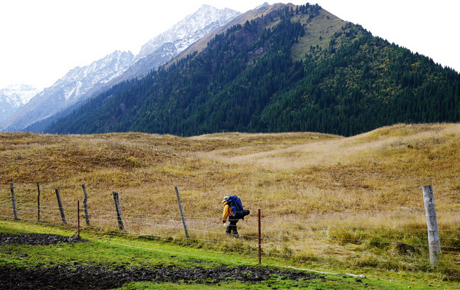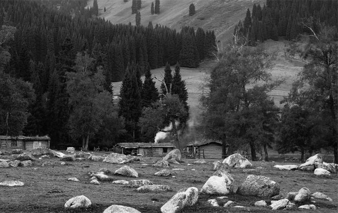 我和李亚还有Ed出去打水,下到10多米深的沟底,我身上毫无热量,明显感到温度的下降。湿的衣服贴在身上一点点攫取我的能量,一阵阵寒颤。远处群山藏青色的阴影里藏着恐怖的欲望,阴天没有星星。远处独狼的嘶吼声分明在示威,引起对面山腰牧民家的牧羊狗群一阵骚动。回到小木屋,我们用链条把门锁死。我回忆起沿途处处白骨,听说有狼群打埋伏,晚上吃掉过向导的马,一夜都睡不踏实。