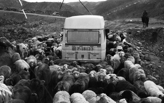 车里已是异域。人们操着听不懂的大舌腔快速地讨论着我们,我们跟他们打招呼的时候他们又躲鬼一样的躲开。车上气氛和车下的羊群一样,一阵紧一阵松的,有着混合了体味的欢乐。前面山羊和牛马的混合军团来袭,把我们的车包得严严实实,司机一筹莫展,停车待命。