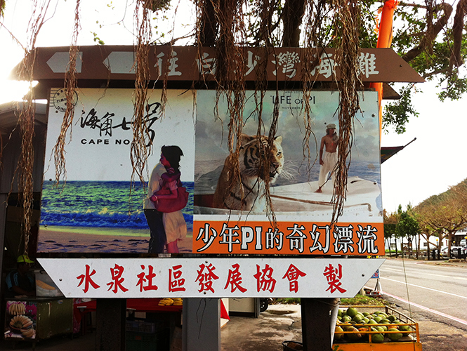 (白沙湾入口处立着电影《海角七号》和《少年派的奇幻漂流》的宣传牌)
