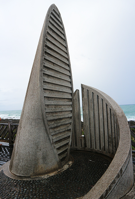 第二天和别的散客一起拼车租了小面包车,游览垦丁国家公园和恒春古城。垦丁,就是“开垦的壮丁”之意。清光绪年间,官方设置招垦局,粤籍客家人应召前来此地垦荒,繁衍生息,才逐渐形成今日的垦丁。垦丁国家公园的范畴不仅限于垦丁里,而是泛指恒春半岛的观光地区。从垦丁驶往鹅銮鼻的路上,经过一处景点船帆石——因屹立在海上的珊瑚礁石像出海扬帆的船只而得名。继续南下,来到砂岛,这里是垦丁国家公园的生态保护区。该区内有个贝壳砂展示馆,给游客科普贝壳砂的知识。贝壳砂是垦丁地区沙滩中的主要组成物质,含有贝壳、珊瑚碎屑、底栖性有孔虫等,其碳酸钙含量多半达60%以上,而砂岛则高达98%。接着,到了鹅銮鼻公园,公园里的鹅銮鼻灯塔是标志性建筑。据说,19世纪时途经鹅銮鼻近海的各国船只常触礁翻船,清政府迫于外交压力才于1883年建起了灯塔。不过,甲午战争之后,清军撤退时把灯塔炸掉了,直到1898年又重建灯塔。“二战”时,灯塔又被美军炸毁过一次,战后才复建。如今,白色的灯塔依旧守着身旁的这片海,只是身边多了些喧闹的游客……公园里有两块挨得很近的石头,被命名为“亲吻石”,强行秀一波恩爱。沿着海滨栈道走走,有点儿浪漫的感觉。又转到鹅銮鼻公园东南侧的台湾最南点(经度120度50分59.7秒,北纬21度53分58.6秒),真有种来到天涯海角的错觉,此时天有点阴沉,眼前的大海像在呜咽。继续前往龙磐公园游玩,站在龙磐大草原旁边眺望太平洋,既开阔又壮观,迎面而来的海风不急不缓,让人情不自禁想哼唱胡德夫的《太平洋的风》:“太平洋的风一直在吹,最早世界的感觉,最早感觉的世界,舞影婆娑,在辽阔无际的海洋,攀落滑动,在千古的峰台和平野,吹上山吹落山,吹进了美丽的山谷;太平洋的风一直在吹,最早母亲的感觉,最早的一份觉醒,吹动无数的孤儿船帆,领进了宁静的港湾,穿梭着美丽的海峡上,吹上延绵无穷的海岸,吹着你吹着我,吹生命草原的歌啊……”我忽然理解了在海边举办户外音乐节,对着大海高歌,是多棒的主意。