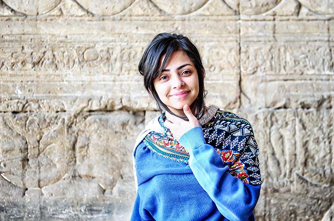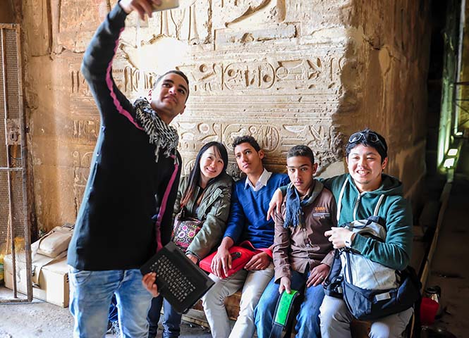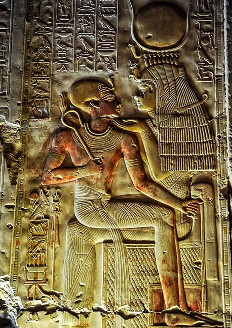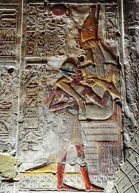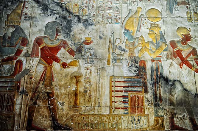 就像现在的穆斯林向往着去麦加朝圣,古时候的埃及人都会想要在有生之年去一次阿拜多斯,那里是祀奉冥神奥西里斯的地方,人们相信通向阴间的大门就在那里的沙丘之中。阿拜多斯有好几处考古遗址,最有名的当属塞提一世神庙,这座神庙有着整个埃及最精美的壁画和浮雕。古埃及神话中,奥西里斯被弟弟赛特杀害,尸体被分为14块埋在不同的地方,奥西里斯的头颅在阿拜多斯被找到,他也在这里被复活成为冥界之神,阿拜多斯正殿前是12根方形立柱,并不在阴影处,但立柱上的壁画颜料依然鲜艳,比如人物皮肤的红色以及衣物饰品羽毛的蓝色,立柱四面雕刻着女神伊西斯和冥神奥西里斯对法老的祝福。美嘉子轻轻抚摸着柱子下缘已被磨得光滑的浮雕,赞叹着在埃及寻古真是太震撼了——随便伸手一摸,都是好几千年。