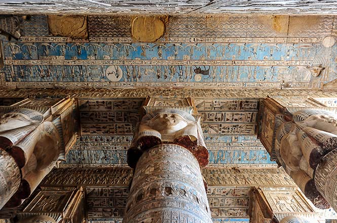 比起阿拜多斯,建于2000年前丹达拉的哈托尔神庙更年轻,也更令我着迷。神庙修建于古埃及的托勒密时期,供奉的是荷鲁斯的妻子——丰饶女神哈托尔Hathor,她的形象是母牛,雕塑以牛首牛耳最为常见,司掌与女性相关的一切:爱情、浪漫、生育、舞蹈和音乐。在丹达拉,每年夏天都有一个庆典活动,祭司们会把哈托尔雕像从神庙中抬出,然后坐船溯尼罗河逆流而上,最后运送到供奉着荷鲁斯的埃德夫神庙,让夫妻二人相会,埃及版的牛郎织女。来到这里的游客很少,这座神庙本身知名度也远不及卡纳克和阿布辛贝,但丹达拉神庙的壁画可以说是埃及神庙中最鲜艳的,最著名的就是天空女神努特的穹顶壁画以及黄道十二星座图。