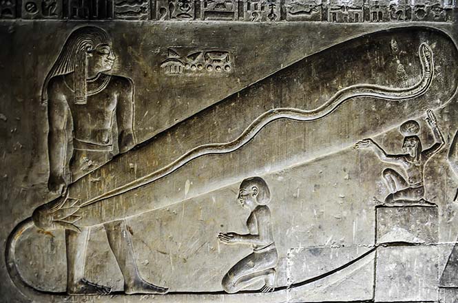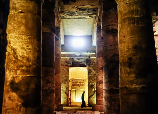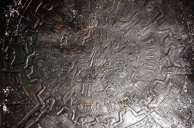 穿过狭窄的楼梯甬道,到达神庙二层,通过梯子可以爬进一个密室阁楼,这里藏着大名鼎鼎的黄道十二宫图。如果不看攻略,一般不会注意到这个天花板上黑漆漆的放射状圆形图案——古埃及人、巴比伦人和亚叙人共同贡献了古代的黄道十二宫系统。不过存于丹达拉神庙的是复制品,真品被收藏于法国卢浮宫,没错,当年拿破仑军队远征埃及的时候掠走的。除了二层的密室阁楼,丹达拉神庙的地下室也不容错过,地下室的入口被破旧的木门掩着,里边空气有点浑浊,通道狭小需要半蹲着前行,慕名前往是因为这里有古代的黑科技——浮雕上展示着类似于电灯泡的东西,引发了历史学家的讨论,甚至把古埃及文明跟外星人又一次联系到一起。