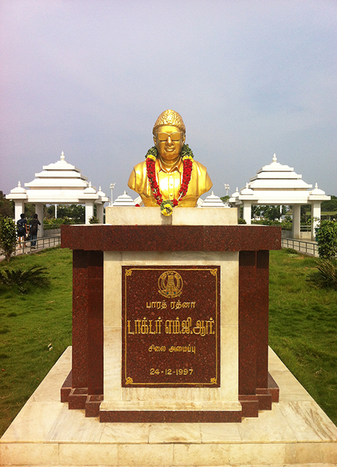 穿过安纳纪念公园,很快就能走到MGR纪念公园(MGR Memorial),这是为纪念泰米尔纳德邦另一位政治家拉马钦德兰(M. ***)而设立的公园。拉马钦德兰也曾任泰米尔纳德邦首席部长,还是印度著名的演员和电影制作人,在泰米尔电影工业中具有举足轻重的地位和文化影响力。公园里拉马钦德兰的金色雕像蛮逗趣,戴着“墨镜”,挂着花环,就跟宝莱坞明星一样“炫酷高调”,相比之下,安纳杜拉伊的雕像显得太一本正经了。大概参观者对MGR纪念公园门口的雕塑都会印象深刻——两片白色的树叶下奔驰着金色的骏马。据说树叶是拉马钦德兰所创立的AIADMK党(All India Anna Dravida Munnetra Kazhagam)的象征——该政党是安纳杜拉伊去世后从其创立的DMK分裂出来的;而骏马则取材自古希腊神话中的神马帕加索斯。琢磨印度的各种党派觉得有点晕头转向,一些政党追溯起来都有千丝万缕的关系,很多时候就是党内人士之间存在水火不容的政见分歧,实力足够强悍的就拉人出去“单飞”了。