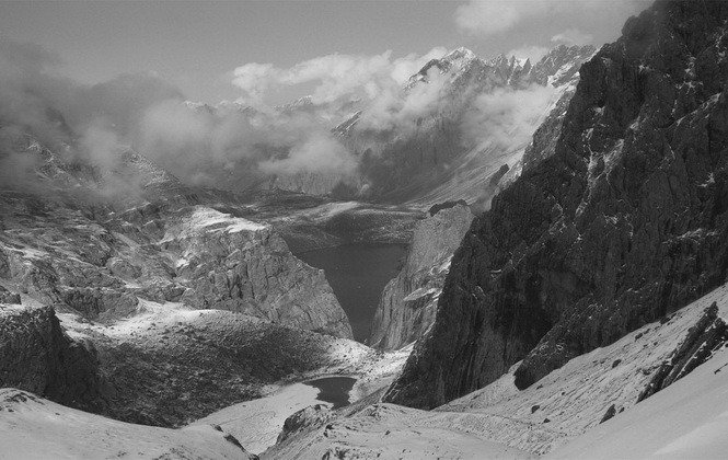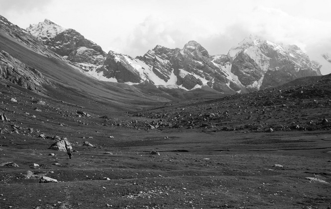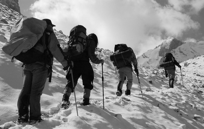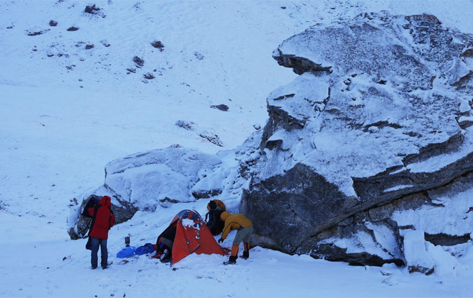 早晨我起来时发现放在内外帐间的水袋还没全冻上,雪下得刚过脚脖子,帐篷外没有风。东面太阳懒起,头顶上云彩安静,今天是个晴天。我狂喊大家起床,一定要趁着雪还没开始融化,尽快翻越达坂,雪融化变软了之后至少要花3倍的力气,才能走得过去。我们只有四副雪套,李亚的鞋子不防水,太阳出来后,我们5个人只有3副墨镜,怕有人会雪盲。但是好像大家都没有觉得这是个非常大的危险。