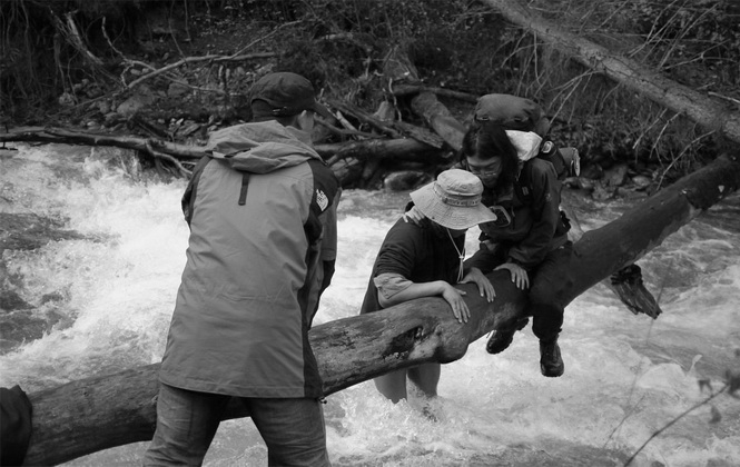 Ed找了个地方要渡河。我看那河上斜着架了两根倒下去的木头,一根太细,一根太滑,李亚已经开始尝试从木头上骑行过去。我尾随他另外找了根胳膊粗细,2米多长的木头,支到河底,开始走木头过河。我战战兢兢走到离岸边还有约1.5米的地方,卡住了,清晨的河水很清,很冷,我问李亚左边能不能跳过去,水声太大,他理解不了。但是他找了跟棍子来,这男人翻手为云覆手为雨,失心疯一棍子就把我敲下河了。