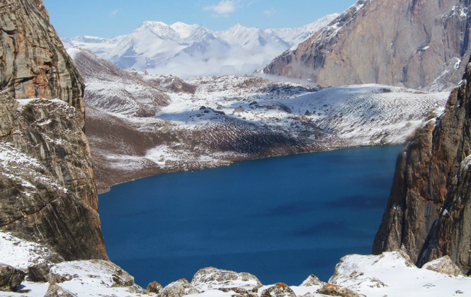 西门和凉风羽在前面踩雪印子,两个腿长的男人,踩出来的印子和我们根本不搭调。前后挣扎爬了5小时,终于爬上了达坂,回身看天堂湖。