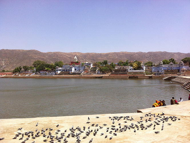 从阿杰梅尔到普什卡的路上,反而能更方便远观阿杰梅尔整座城市的概貌:被延绵的群山环绕,大多数建筑都是白色的,还有一个美丽的大湖,看起来赏心悦目。巴士越往西走,空气越干燥,有点进入沙漠的感觉,路边渐渐能看到仙人掌等干旱地带的植物。到了普什卡的停靠站,给旅馆老板打电话,他让伙计骑摩托车带我到了旅馆。登上旅馆楼顶可以俯瞰全城,四周的房屋看起来有些杂乱,环绕此地的群山显得有些贫瘠——不是那种满山遍野的青绿色,而是灰黑色。