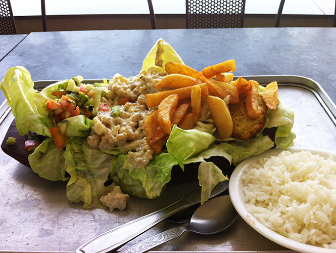 第二天中午,我又到普什卡湖一带溜达。大太阳下,浴坛上人不多,只有一群群鸽子不畏暴晒,在地板上走来走去。湖水看着比瓦拉纳西的恒河水干净多了。午餐又绕到“Out of the Blue”的街上,不过决定尝尝它对面那家猫途鹰推荐的“Rainbow”(彩虹)——普什卡的餐馆起名可真逗,总喜欢和颜色搭上点关系。在“Rainbow”点了个印式铁板烧(sizzler),味道也不错。虽然普什卡是严格的素食之城,但餐馆为了提高游客的满意度,算是尽力用厨艺弥补了缺憾。