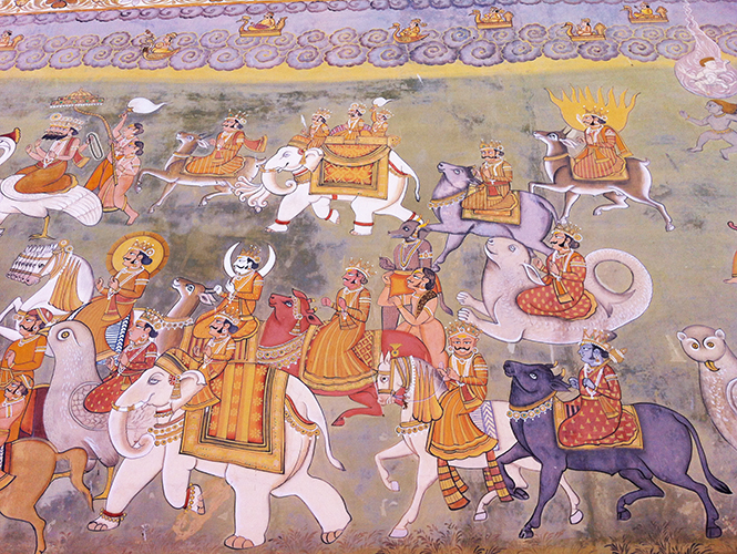 第二天睡到自然醒,之后先到焦特布尔最具标志性的景点梅兰加尔堡(Mehrangarh Fort)看看。由焦特布尔王公拉·久德哈(Rao Jodha)始建于1459年的梅兰加尔堡,是拉贾斯坦邦最壮观、保存最完好的城堡。尽管通往城堡的道路有些崎岖难行,但看到高耸于山岩之上的雄伟城堡立马被镇住了。城堡里的部分建筑被辟为博物馆,各种藏品如王座、绘画、地毯、武器等让人眼花缭乱,有些厅室的装潢风格富丽堂皇,尽显王家风范。古堡的纪念品商店也颇有亮点,其中一些产品的设计既充分运用了馆藏传统艺术元素又时尚实用。不过,站在城堡的制高点俯瞰焦特布尔全城才是观光的高潮,山下老城一片片蓝色房屋尽收眼底,“蓝色之城”由此得名。斋浦尔的“粉红之城”是出于政治所需造就的,而焦特布尔变蓝似乎是居民自主的选择。至于它何时变蓝、为何变蓝,则难以考证。有一说法是很久之前有居民把房子刷成蓝色,发现竟有驱蚊作用,口耳相传,于是越来越多人效仿,全城因此变成“蓝色的海洋”(其实蓝色并没有驱蚊作用);还有一种说法是该城居民崇拜梵天,所以把城市刷成了梵天的代表色系。