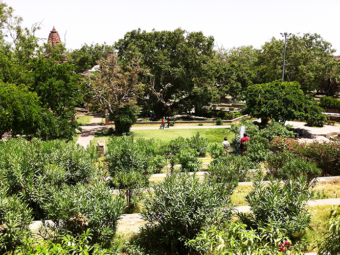曼多尔花园曾是焦特布尔建城之前拉索王朝(Rathore)的都城,如今是对外免费开放的大花园。花园里王公们的陵墓、庙宇、纪念碑等修得相当精美有气势,还种了各种绿植,这在偏沙漠地带实属难得。可惜地上垃圾比较多,文物有些疏于管理,一些人爬上石雕拍照也没有工作人员制止。公园里还有印度人试图和我合影并索要“拍照费”,我无可奈何地笑笑说:我并没有想要和你合影喔,你搞清楚状况。