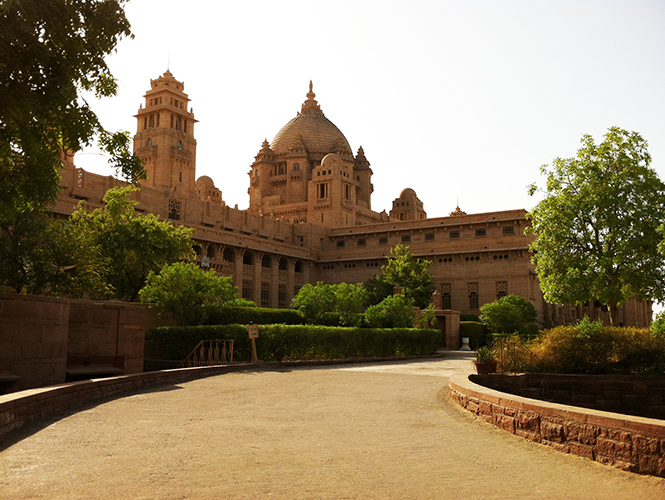 焦特布尔最“炫富”的景点要数乌麦·巴旺宫殿(Umaid Bhawan Palace),据说是仅次于英国伦敦白金汉宫的全球最大私人住宅之一。1929年,乌迈德·辛格(Maharaja Umaid Singh)王公请来英国建筑设计师主持修建乌麦·巴旺宫殿,直至1943年才建成这座拥有347个房间的豪华王室家族起居建筑。目前宫殿的拥有者是伽杰·辛格(Gaj Singe),只开放部分博物馆供游客参观,部分房间作为豪华酒店(Taj Hotels)运营,还有部分私密住宅区仍住着焦特布尔的王公贵族成员。整个宫殿位于半山腰,气势磅礴,黄砂岩的建筑在阳光下熠熠生辉。宫殿外形运用了文艺复兴时期的高大穹顶设计,并辅以印度传统风格装饰,室内的镀金家具和贵重艺术品更是闪瞎眼。在宫殿外的大草坪边上,有一条豪车走廊,停放着各种豪车(包括老爷车),不过我对汽车一无所知,没有对我造成多大的震撼效果。