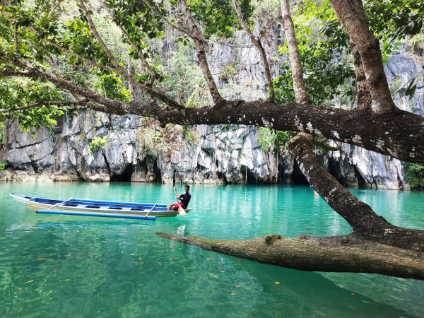 “Wake Up!”,在近半小时浸入漆黑的沉默之后,小舟上的菲律宾船夫对着满船的橘黄色救生衣叫唤。向着阳光烘烤的碧绿湖面,驶出黑暗深处的乘客们,包裹在救生衣里,纷纷发出“Oh, nice”的赞叹声。