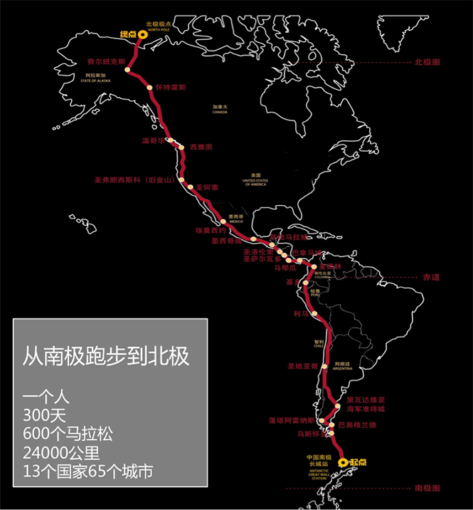 “2018年3月1日中午一点,也是中国传统元宵节子时,白斌以中国长城南极科考站为起点,沿一条风光奇美的近海路线跑出18.8公里后,又加跑2.5公里至南极机场结束,跑程共计21.3公里,完成了一个标准的半马。白斌对自己南极首站的开跑表现相当满意。他诙谐地把这第一个里程称为‘开张生意,开张大吉’。并遥祝祖国人民元宵节快乐,祝愿家人朋友身体健康,万事如意。”