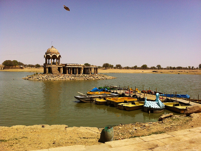 准备离开杰伊瑟尔梅尔这天上午,我还去逛了加迪萨尔湖(Gadisarlake),湖挺小的,但在沙漠城市中已属难得。看完湖,我坐在离湖不远处的民俗博物馆(folkloremuseum)门口的石阶休息,皱眉看着大太阳,不想挪步。从这回到旅馆得走约20多分钟。边上一个印度大叔挪过来和我聊天,说你猜今天多少度?我说超过四十度了吧!大叔说:四十八度,你勇猛啊,这个季节游客不多。聊了一会,我说我下午的火车去德里,得回旅馆了,懒得走,想找Tuk Tuk车。大叔说,我有摩托车,我带你过去。我想都没想就问:多少钱?大叔说:不用钱啊,我正好要出去,顺带捎你。我一阵错愕,心里直嘀咕:还有这么好的事儿?不过,天气实在太热了,不想走路,就算到时候被敲竹杠我也认了。大叔乐呵呵地开着摩托车三弯五拐就带我回到了旅馆,道别时还和我握手。我对自己的恶意揣测感到羞愧。“金色之城”的当地人,也和这儿的阳光一样热情啊。