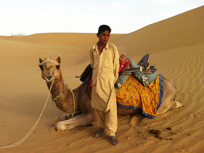 就这样开始了塔尔沙漠一个半小时的骆驼沙漠之旅。刚骑到骆驼身上时有些害怕,牢牢抓着驼背上的把手,然后骆驼“呼啦”半站起身,再全站起来。“就当是坐车”,萨迪克拍拍骆驼,对我说,然后他们开车一骑绝尘而去。坐骆驼可不是坐车,觉得像是在半空中悬浮,心想摔下来就惨了。牵骆驼的向导竟然是个孩子,看起来还没有十岁,笑起来憨憨的。小向导话不多,但有问必答,英语还不错,能进行简单的交流。和他拉家常,问他家里有多少头骆驼。他说,骆驼不是我家的,是老板的,老板有35头骆驼,这头我会牵回家,照顾它,和它一起工作。他告诉我,Camel Safari旺季的时候人很多,每天要出动十几二十头骆驼。看得出来,小向导对这片沙漠熟悉得如同自家的后院,看到沙漠里的动物还会叫我看“look,deer”,我闻声赶紧拉开头巾,果然看到一头鹿。有时候,我想停下来拍照,他就让骆驼停下来让我拍个够。除了偶尔会“刹车”吃沙漠里的草,骆驼基本全程都很听话。小向导爱唱歌,兴起时唱一唱,唱得真好,唱累了,喝口水,继续唱。有时候,我们不发一言,默默地在一望无际的沙漠走着,周围看不到其他驼队,我包得只露出眼睛,在炙热的空气之下,身体仿佛脱离躯壳,漂浮在蓝天、黄沙的虚空里。我看着这孩子和骆驼的背影,不禁有些心酸:也许这世上就没有真正的平等,这般年纪的孩子,本该在父母的宠爱下成长,读书、游戏,但他却要早早工作、持家……
