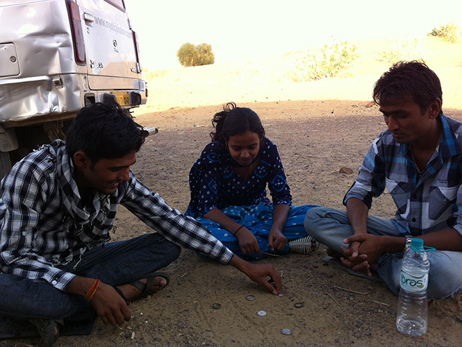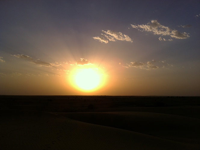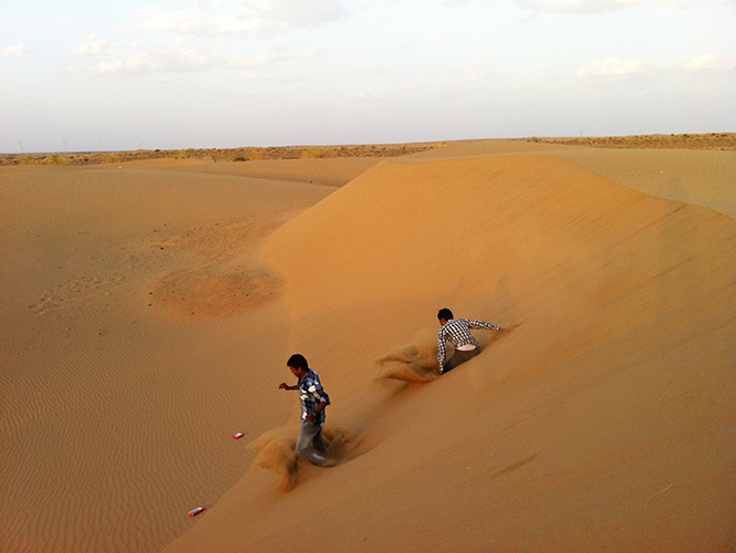 阿斯妮法和索卡都是非常爱拍照、会摆pose的人,他们教了我一种独特的印度式拍照pose:三人坐在沙漠中,一人捂眼睛,一人捂嘴巴,一人捂耳朵,表示“非礼勿视、非礼勿言、非礼勿听”,据说这个主张源自“圣雄”甘地。我最后悔的是没带相机,而手机在太阳的热烈炙烤之下竟然半道罢工了,所以在沙漠玩的许多照片都是索卡代劳。拍完照,大家索性躺在沙上看天空,感叹:好蓝,好美。我和阿斯妮法之前都决定不在沙漠露营,后来都有点后悔了,夜晚在沙漠露营看星星应该感觉也很好吧。