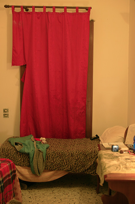 作为主人的房间,进去之后才发现实在太过简单了,两侧墙上挂着一张油画和一张水彩画,走近细细一看,是老太太年轻时的画像,幸福的微笑的美丽的脸。大小两张床各临着窗,水磨石地板,大红的窗帘边掉了半截,靠墙摆着一张桌子,桌上堆着几条烟和零零散散的化妆品,十几吋小电视挂在她床头正对面。