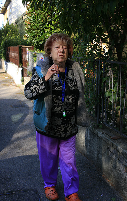老太太一头灰白大卷发,眼睛占了脸的大部分,个子不高,穿着色彩艳丽的高根鞋,涂着大红的口红和指甲,两腮粉红,在清晨的阳光里,她斜叨着烟,半眯着眼,双手托着我的脸:“真漂亮!真漂亮!”