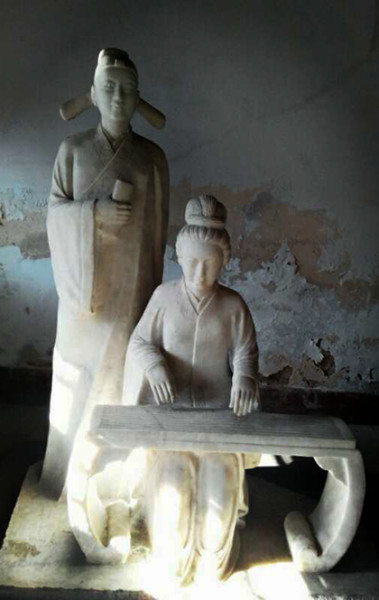 进到纪念馆转了一圈,院子不大,有一处石头垒成的水池。厢房左侧是李清照和赵明诚汉白玉的雕塑,李清照在弹琴,赵明诚手里拿着一卷书,饶有兴致地地站在一旁欣赏(海波说李清照的手法像是在弹筝,另外,古琴长得也不是这样子,李清照不会去乱弹这种“类琴”的。雕塑的活儿让石匠干了。立峰大概也是这意思,说这琴有些不伦不类)。墙上贴着两行字:天真的少女,美满的婚姻。厢房右侧是李清照的卧室,帷幔上积满灰尘,感觉很久没住人了,双人床上被子叠得很婉约,一看就是女主人亲手叠的。