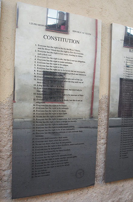 1997年愚人节这天,一群艺术家、左派青年、梦想家和酒鬼喝大了,他们站出来宣布成立独立的共和国——对岸共和国(Uzupis Republic),并颁布了国旗、货币、总统、宪法,还有一支11个人左右的军队。四月一号愚人节这天成了宪法纪念日,另外一个重要的节日是三月二十一号的新年,这天国民会烧掉旧日记。共和国的国旗有四面,分春夏秋冬,宪法有四十一条,像是一首现代诗。这个政权至今未被任何一国政府承认,总统Romas Lileikis是立陶宛诗人、音乐家兼电影导演,对岸共和国有四位名誉市民,除了三位立陶宛的艺术家:Jonas Mekas, Ugnė Karvelis,Zenonas Šteinys,还有 一位宗教人士。