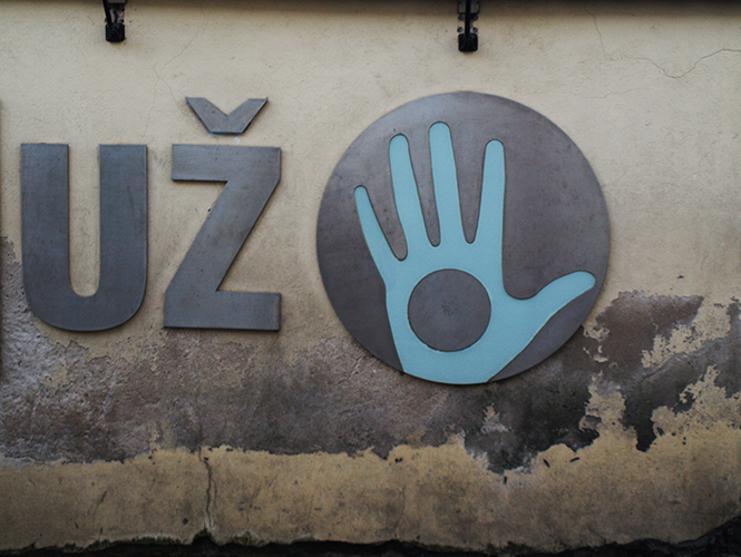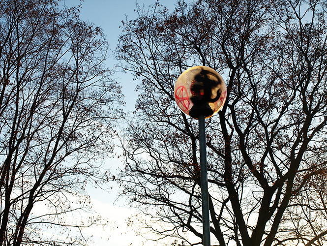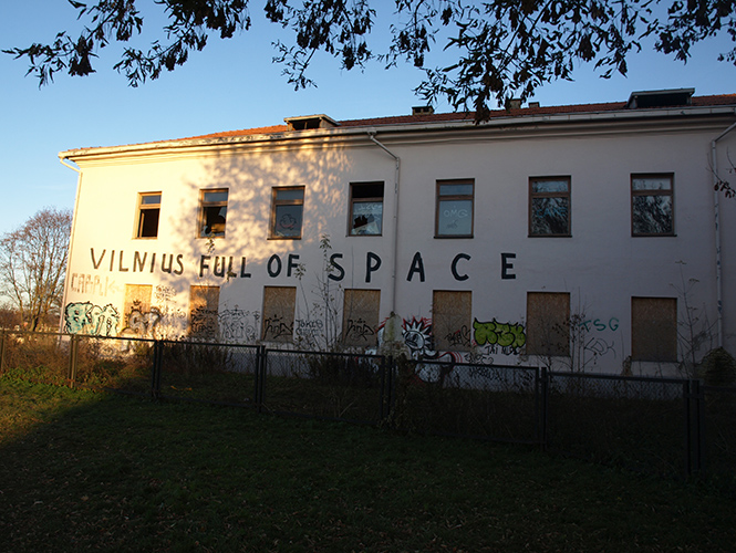 通往对岸共和国的桥与大部分略有景色的铁链桥一样,挂满了同心锁。走过交界河的蒙娜丽莎像,就是国境入口了。主街与许多欧洲城市的另类艺术街区相似,布满了画廊、咖啡馆、工艺品店、纹身店和有机食品店。这条路的命运大概和大理的人民路,北京的五道营颇有相同,难逃自边缘到主流和商业化的演变,这个曾经破败的另类文化区无可避免地成了一个游客的朝圣之地。转了一个弯到小巷里,是更老旧的Uzupis本来的样子:不起眼的工作坊,落魄的squat,布满涂鸦的艺术空间。傍晚的日光穿过冬天的冷空气,在地上拉出长长而凛冽的影子,灯柱上喷绘着无政府主义的标志。不经意走入一个艺术现场,柏林来的艺术家和当地艺术家一起在墙上画着大幅的作品。像是蛮重要的一件事,另有许多酒水分与大家喝。似是已经微醺,对画作毫无印象,熟识的、陌生的、身着彩衣的艺术家与旅人手捧冒着热气的香料红酒,彼此招呼着。包立在一旁,等待它的主人慢慢物色今夜的落脚处。