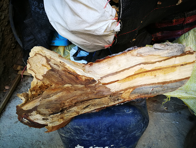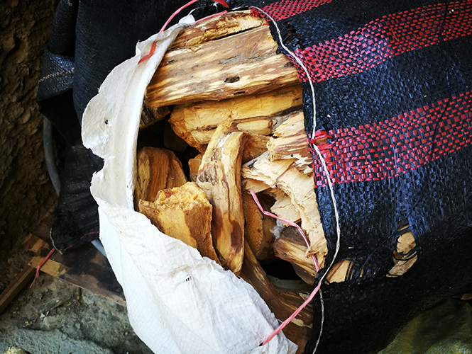走了两公里,来到一个村落。男人的老婆等在村口,将我们接去家里。在她家房屋右边的一个石坎下面,用编织袋包裹着两大袋圣木,都劈成了手掌大小,旁边还有两截碗口粗细的树干,三四十公分长。接下来有十分钟,我整个人处在一种迷茫中,思维走失,我无法想清楚这是一件什么事情,棠小溪那样郑重地让我找寻的圣木真的就是这堆柴火一样的东西吗?它辨识度极高的香气提醒我它就是,但我心里还是不能确定,十索尔一公斤,比一盘秘鲁炒饭还便宜。介绍圣木的文字里是这样说的:必须用死树枯枝,还得放置三四年才能蕴藉出它的香。事实是怎样?不得而知。