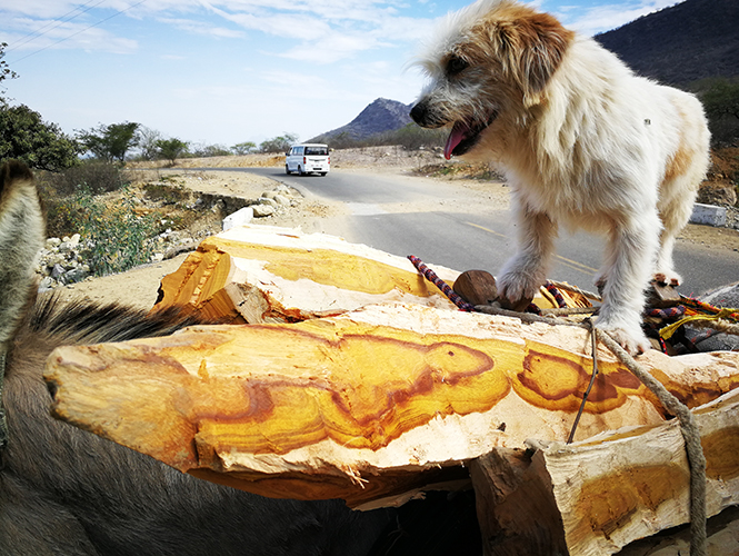 摁第一下快门的时候,我已经发现驴子身上驮着几根木头。趁着他们说话,我小心防着狗狗,闻了闻木头,没有什么味道,确认了不是圣木。但还是好奇,它的树心不常见。