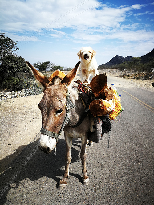 当时我见路边有种白色的喇叭花很好看,就叫停了车。一扭脸就看见了站在大牲口背上的这条狗。然后认出来大牲口是一头驴。请Luna问赶牲口的男人能不能拍照,他刚点头,我就按下了快门。随后李镇宇跟Luna也加入进来,拍驴和狗,跟驴和狗合影,又跟赶驴的大兄弟合影。