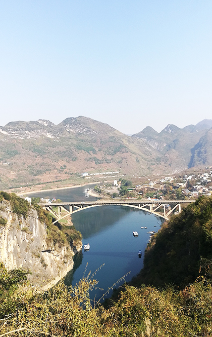 在六广镇,我拐下贵毕公路,只见六广大桥横跨在青绿色的六广河上,依然显出雄奇飘逸的气势。俯瞰河水的街边,全是停车住宿的鱼庄饭店。卖泳衣的小铺悠然开在桥头,尽管此时早已过了下水的天气。因为修建六广大桥,当年的古驿道已经废弃,只留下一段破败的石板路。即便是六广镇的居民,也大都忘记了它的存在。