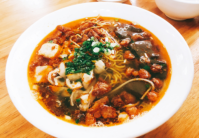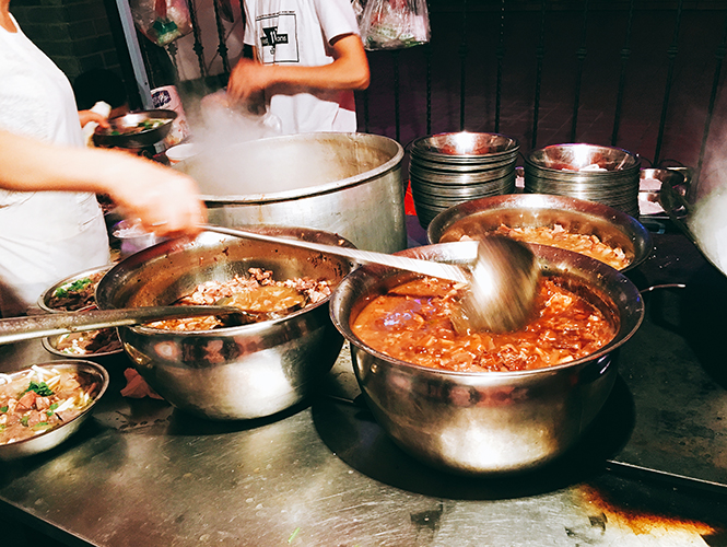 在这些小吃摊档中,“社会牛肉粉”是一家独特的存在,堪称江湖传奇。据说整条巷子的生意都由它带起,似有深巷一哥的地位。其他家基本是炒粉、小烤肉,独这家是煮食。作为巷子里生意最好的一家,铁打的牛肉粉,流水的食客。一张桌上,两口大锅,一锅煮粉,一锅炖着牛肉高汤,烟雾缭绕,香气四溢。另外几个大钵里,装着牛肉臊子,有牛肉片牛腩牛筋牛杂等。生意非常繁忙,小哥各个手快,抓粉、下粉、捞粉、浇头,功夫出众,眨眼功夫一碗热气腾腾的粉就端在手上了。