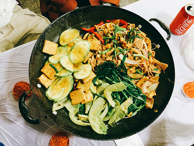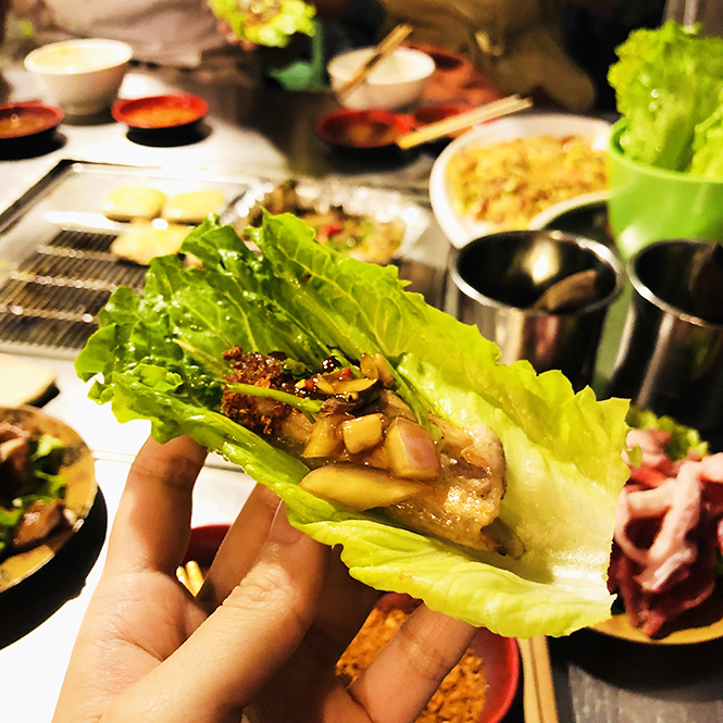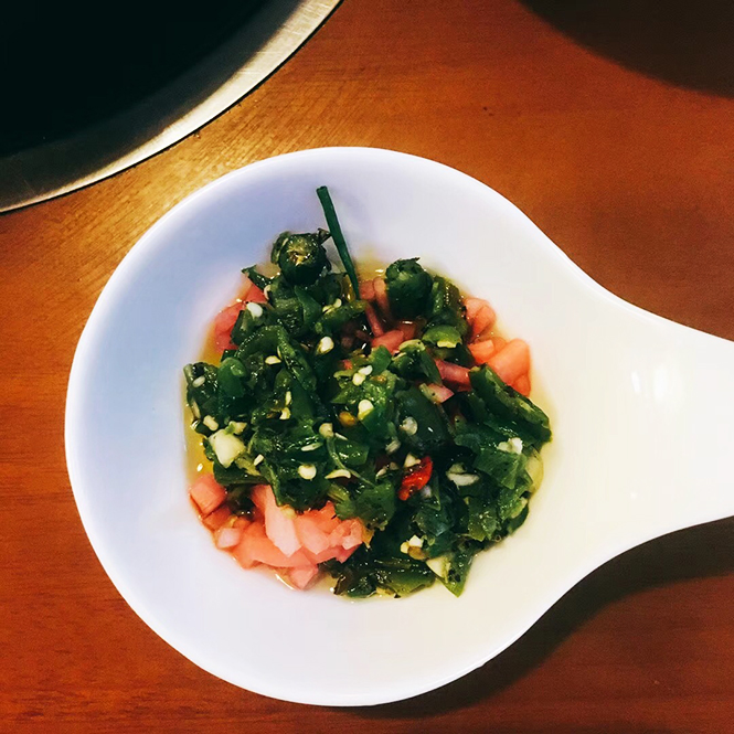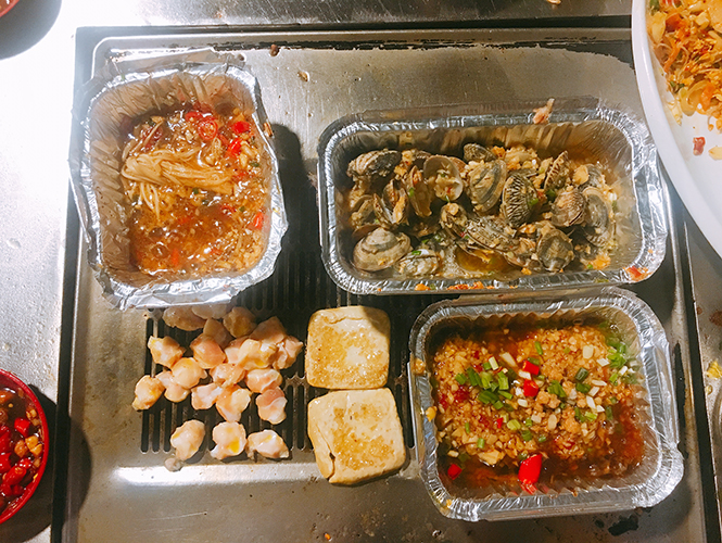 这家的锡纸茄子、花甲用了蒜蓉酱调味,看到网格上花甲一个个张开、茄子油汁滋滋冒泡,食欲大开。烤梅子肉、五花肉,最有特色的是蘸料,折耳根、酱油醋、小米椒、洋葱、花生等拌在一起,一小碗,一张生菜一片烤肉再加一簇蘸料,啧啧啧。放眼一望,每张桌上都热气腾腾冒着烟,食物在眼前煎烤着,杯盏交错,人语喧喧,这是俗世的热闹。
