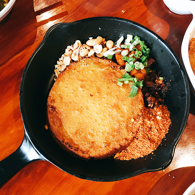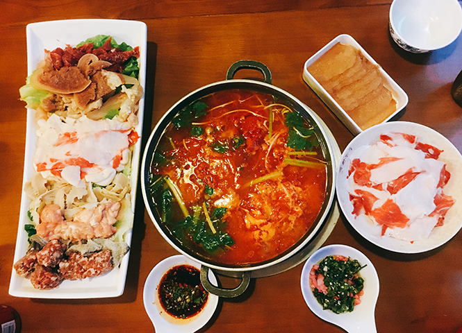 一个贵州好友从高中起就给我安利烙锅,这次在陕西路终于拔草。贵州最出名的是水城烙锅,据说始于清代,最早以前是把野味野菜放在生火的瓦片上烙熟来吃,后来改为用生铁锅。锅底刷油,蔬菜肉类平摊锅内,慢慢地烙,人们围着锅,喝酒聊天,看着锅内的荤素小菜冒着油泡,香气四溢,手边是一个小蘸碟,放着香喷喷的辣椒面,一边烙一边蘸着吃。吃烙锅讲究的就是闲,小酒小菜小火炉和一口大锅伺候着,什么菜都可以烙一烙,听着滋滋声,慢慢谈天说地。