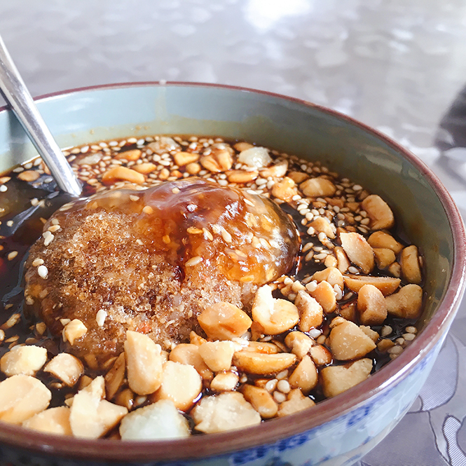 青岩古镇是贵州四大古镇之一,留存有颇具规模的明清古建,地道美食也不容错过。谢家百年粑糕稀饭便是一味,底子是粘稠的藕粉,一个煮熟的米糕团,撒上玫瑰酱、瓜子、芝麻、花生碎,满满当当一碗,看上去以为很甜,用勺子把米糕捣碎,吃了一口却发现是清淡的甜,香糯细滑,温温柔柔;清明时节,街上也有卖清明粑,用清明花和糯米做成,青岩人在路边支个小炉子,在平底锅上文火煎着一块块翠绿色的清明粑,一口下去才发现这么小的糯米粑里还有红糖,就像广东的流沙包一样,被烤得暖烘烘的红糖,咬一口就流出来,糯米粑又有淡淡茶香,清甜可口。