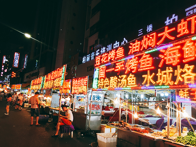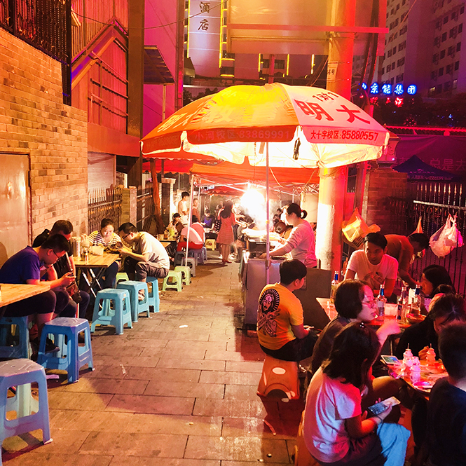 在南国花锦商场的旁边,有一条小巷,白天,它是一条平凡无奇的通道,夜幕降临后,这里就成为一条人头攒动、热闹非凡的小吃街。篷布伞、火炉子、折叠椅、塑料凳,一条灯火长龙,魔术一般出现在巷子里,几乎形成一条流动夜市。大妈大叔就在摊位前的大平底锅里翻炒着食物,炒粉、炒饭、炒土豆、杂菜,油滋滋地发着响声,烟雾和火光交织,人们蹲坐在小板凳上,呼哧呼哧地吃着,手边是冰镇汽水,陌生人也可以毫无障碍地面对面坐着吃。