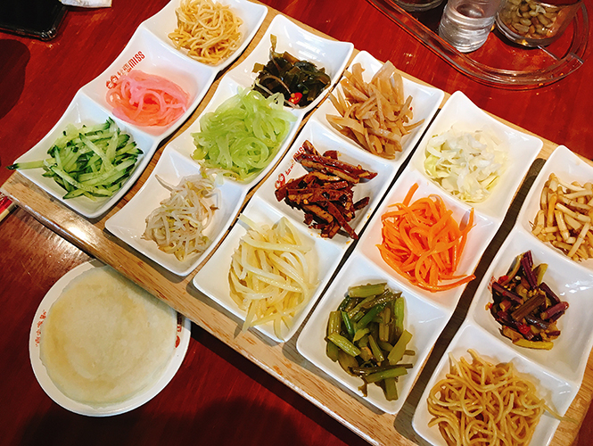 这是一种素春卷。小碟装满切丝蔬菜,整整齐齐摆放,配一叠面皮,和番茄熬制的红汤。鲜红、翠绿、洁白、嫩黄,缤纷的色彩组合。小碟装着,巴掌大的面皮裹着,女孩子盈盈素手夹一小撮菜包进面皮,转手一裹,就有了小家碧玉般的秀气精致。就着红酸汤吃,酸爽可口,这也是别处春卷没有的吃法。