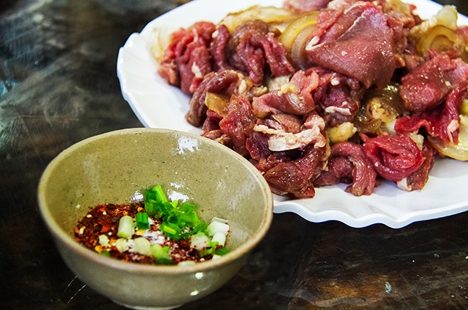 端了碗找个位置坐下嗦粉。圆粗粉软软滑滑,牛肉汤清爽香郁,汤面飘着油花和胡椒粉,嗦进嘴里,喉咙都要唱歌。喜欢吃辣的还可以自助加干辣椒面,又是另一种风味了。这种贵阳本地人的深夜小食堂,要不是有土著推荐,还真不知道。