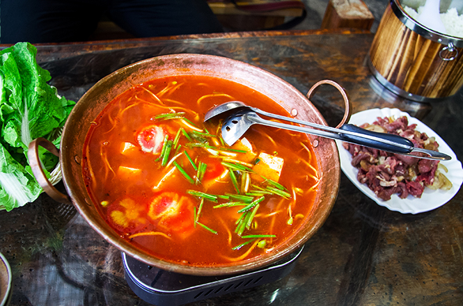 因我不喜欢吃鱼,所以独爱酸汤牛肉。它可以说是我最喜爱的贵州美食。在贵州,一般做火锅的酸汤,分白酸汤和红酸汤。白酸汤是用清米汤在酸汤桶中慢慢发酵而成,而红酸汤是以红辣椒、番茄为主料,熬制、发酵而成的。红酸汤色泽鲜红,醇香浓郁,酸酸辣辣,一口难忘。每次到贵州,我都心心念念着,一定要吃一顿酸汤牛肉。