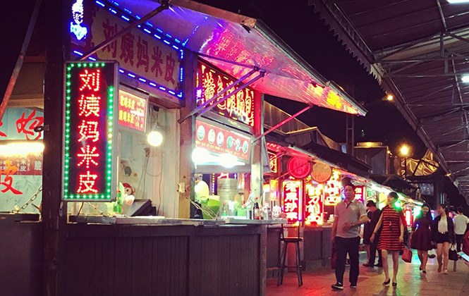 陕西路夜市,也是一个热闹所在。步行过去的路上,上了天桥,就看到一条直直的大马路两旁,全是宵夜档的帐篷依次排开,花花绿绿的霓虹灯在闪烁招摇,颠锅炒菜的声音、招揽顾客的声音,勾引着人们的食欲。烤鱼大虾酸汤鱼,卤味烙锅花甲粉,琳琅满目,不知作何选择。