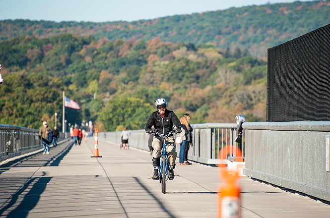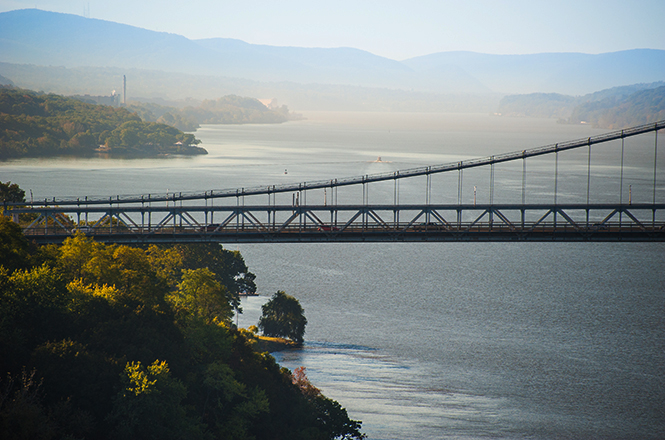 丑陋的人工干预在哈德逊河谷行不通。几百年来,这里的树木除了长得更高更密之外没有什么变化。数座本着便利交通功能而建立的伟大桥梁横跨了河流,其中包括最著名的哈德逊河高架步道桥——虽然这名字实在没什么创意。这座世界上最长的人行高架天桥,在哈德逊河两岸分别连接着乌尔斯特郡的劳埃德镇和波普基西市的达切斯郡。天桥全长1.25英里,64米的高度在河谷地带没有对手,人们站在桥上可以鸟瞰哈德逊河、卡茨基尔山和邻近地区的美丽景色,包括广袤的原始森林,几座历史久远的教堂,以及两条通往纽约市和加拿大的漫长铁路线。